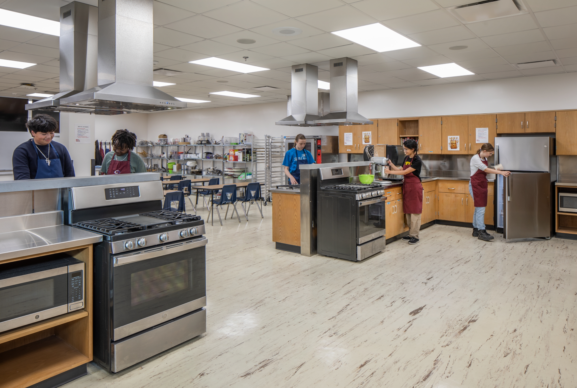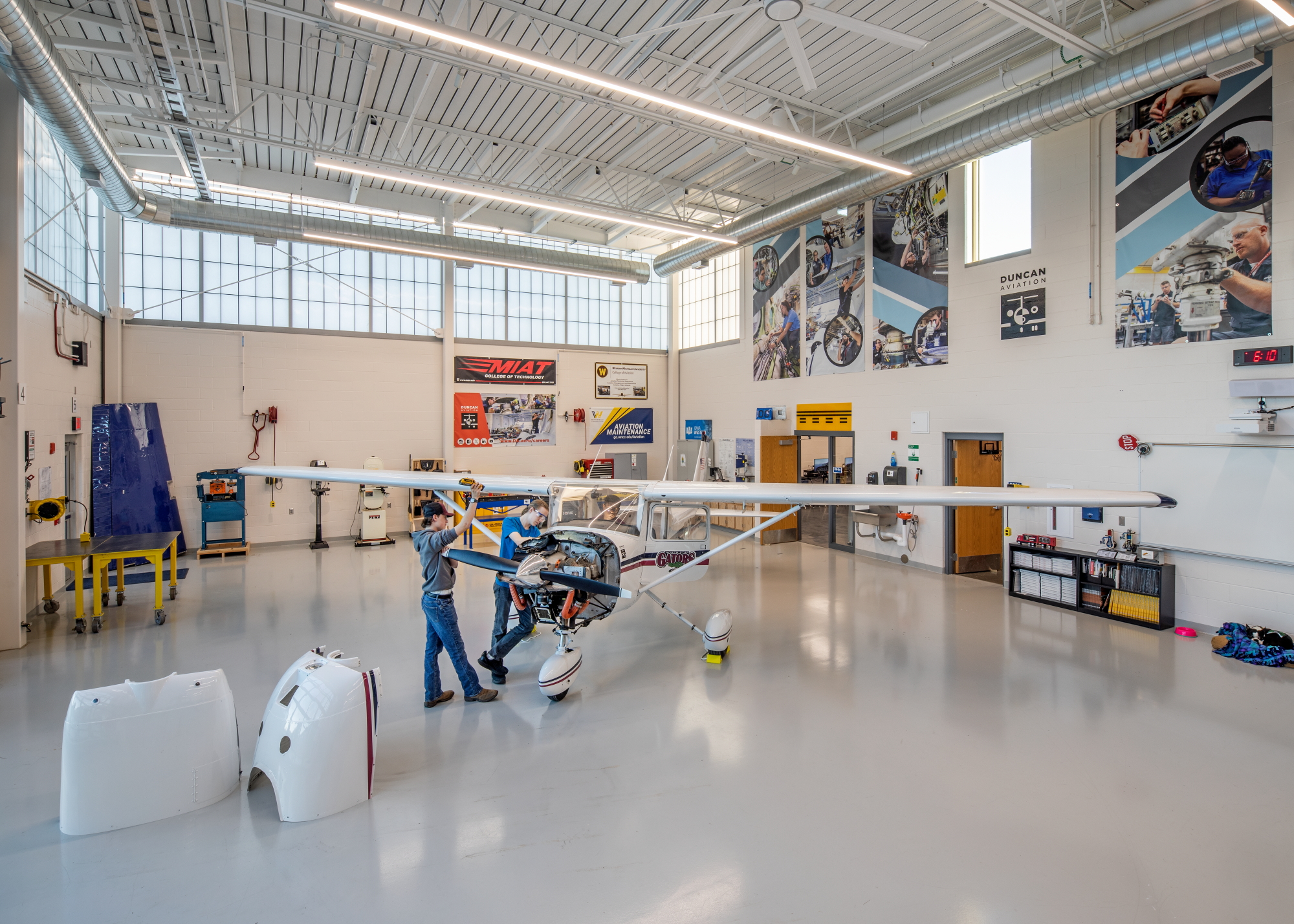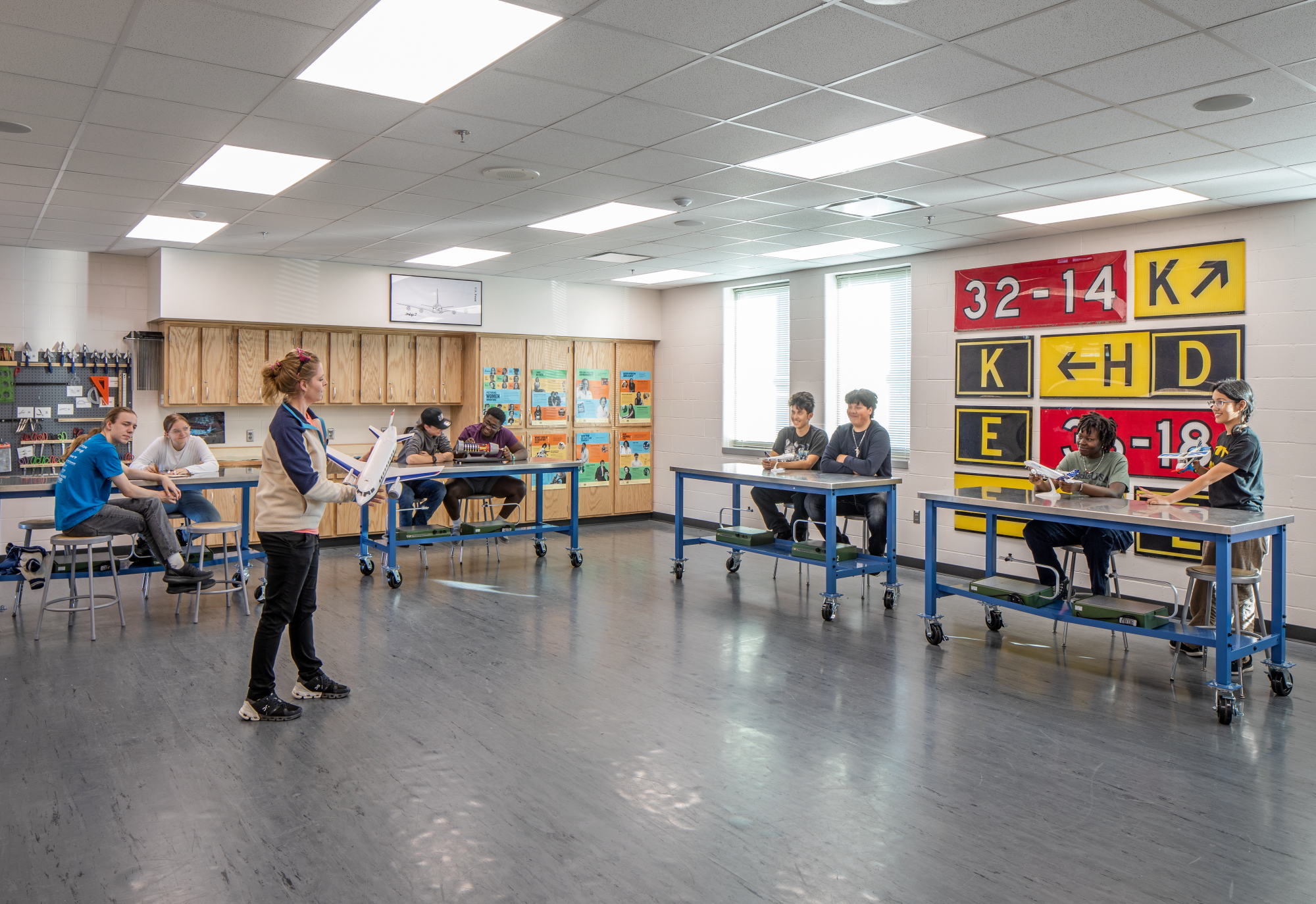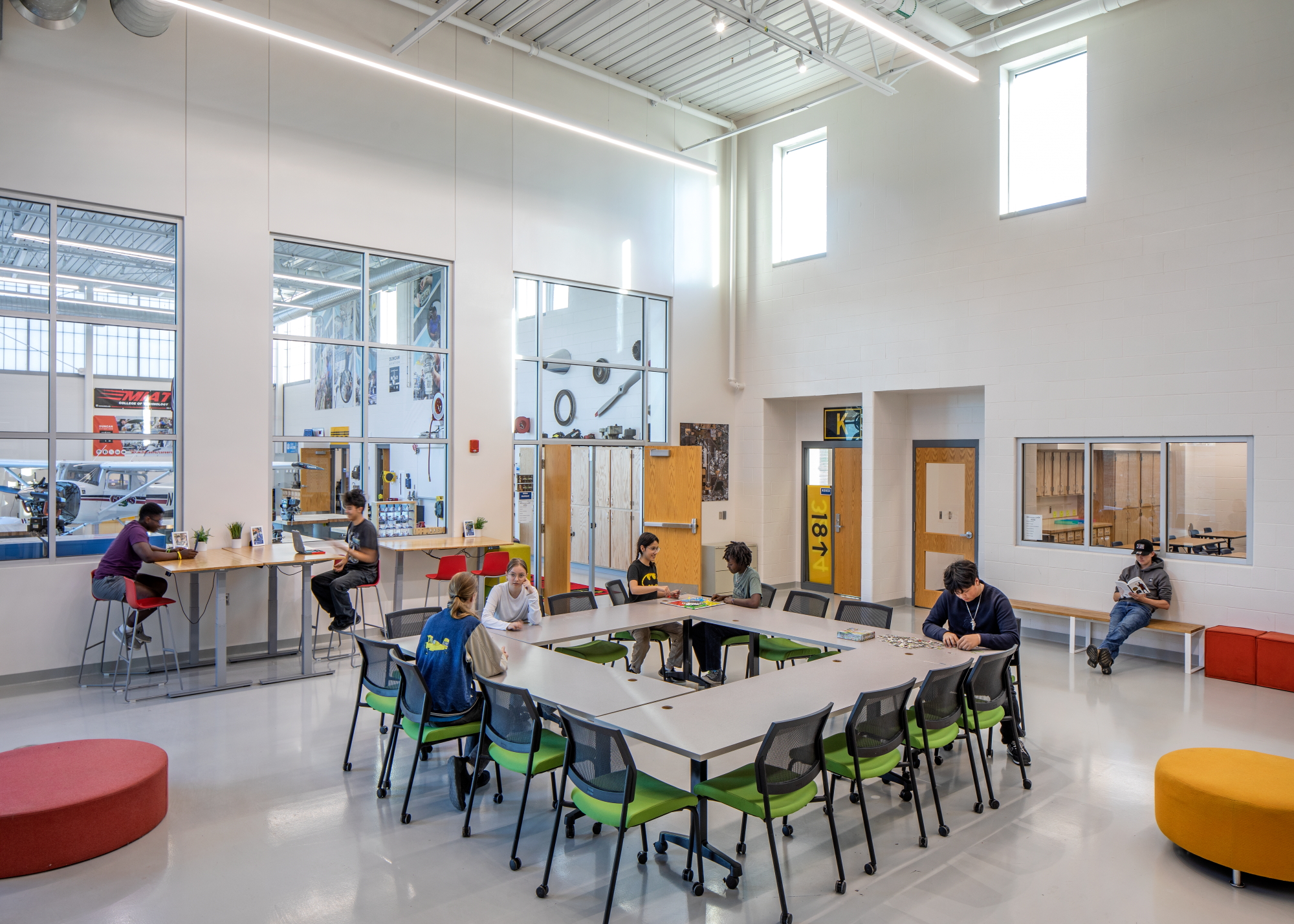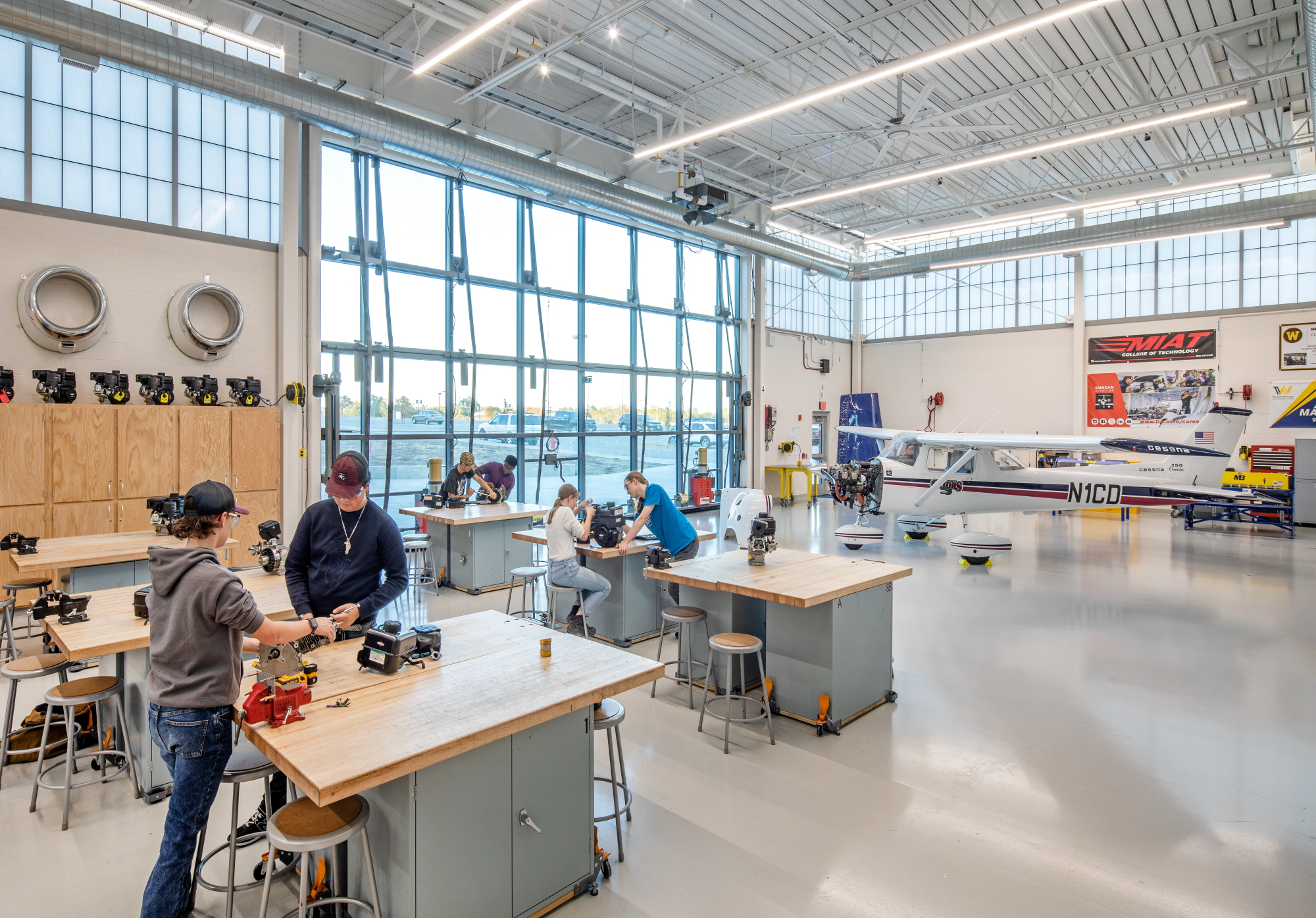 The new aviation program spaces include general classrooms, a specialized simulation lab, and a flexible innovation lab designed to support multiple curriculum areas. The innovation lab is organized into three dedicated zones: a main innovation lab for collaborative projects and experimentation, a power mechanics instruction zone for equipment-focused learning, and an Aviation 1 & 2 instruction zone supporting foundational aviation coursework. With extensive experience in educational environments, particularly Career and Technical Education (CTE) facilities, MEI understands the enhanced level of equipment coordination these spaces require and works closely with the design team to create environments that support hands-on instruction and evolving technologies.
