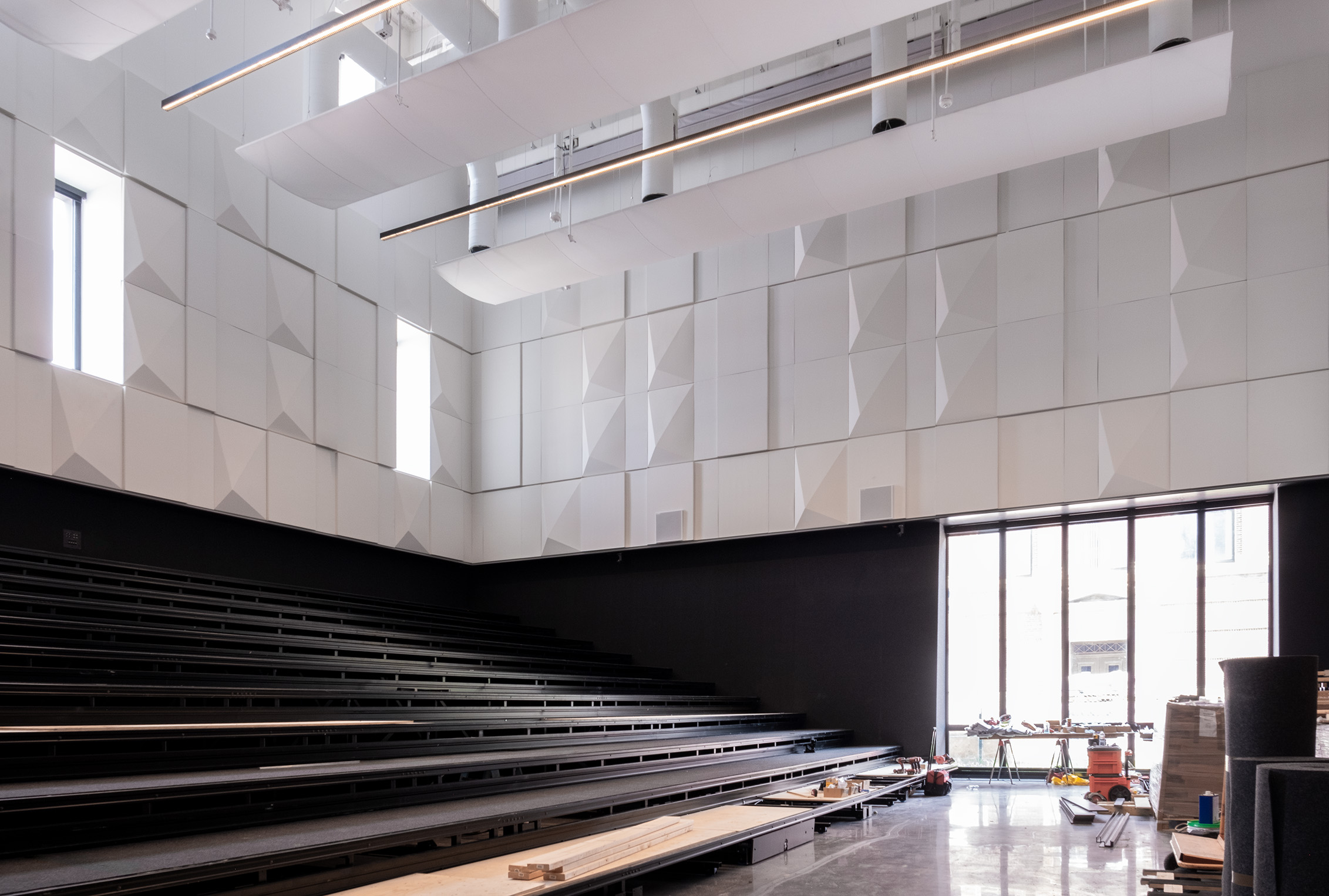 The project also introduces inviting outdoor green space, thoughtfully integrated into the campus fabric, to host concerts, community events, and informal gatherings, expanding the performance experience beyond the building's walls.