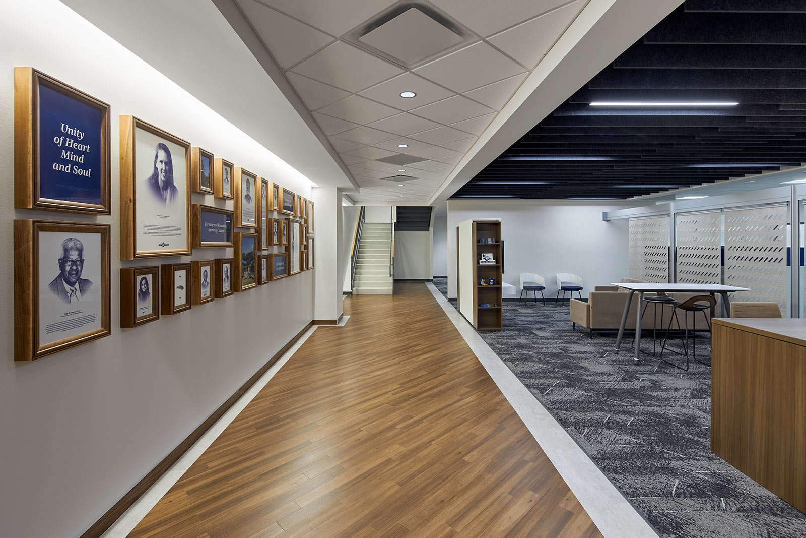 Infrastructure and lighting improvements further elevated the learning environment. LED lighting was added along the south-facing windows to enhance comfort and energy efficiency, and building systems were updated to support modern educational demands. The southeast entrance was reimagined as a new primary gateway for Admissions, marked by a revitalized plaza and a striking globe sculpture that reflects the College's global perspective.